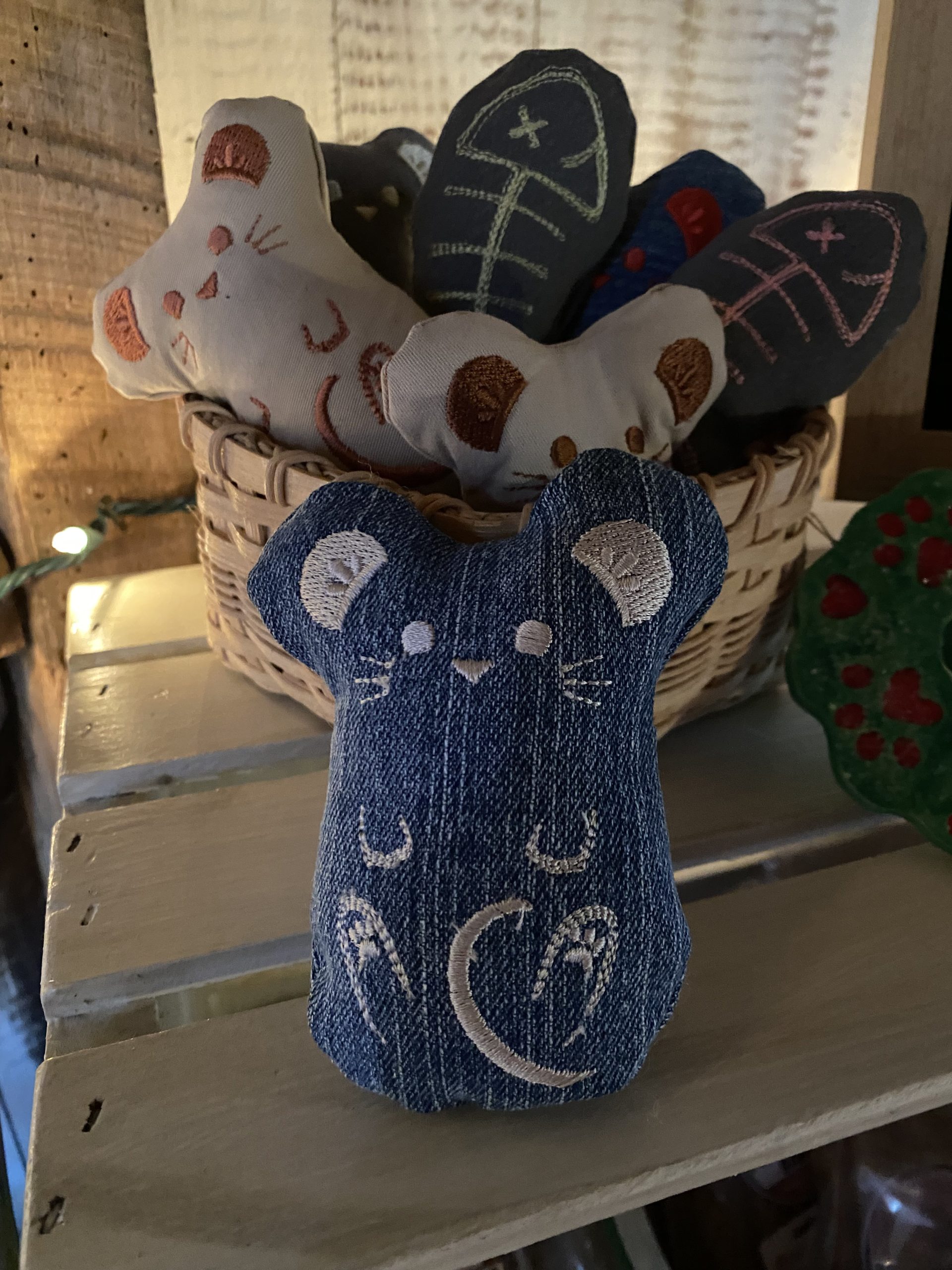 Darling little stuffed mouse, machine embroidered and assembled. Layered with organic catnip in the stuffing. Made with reclaimed fabric and love.