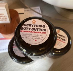 This butter can be used on everything BUTT the kitchen sink! Seriously though, this is probably the best butter I’ve made to date. It absorbs well, is silky, soothing, not greasy and is great on noses, paws, chapped skin, burns, eczema, heels (exfoliate first), dry skin, everything BUTT…well I really haven’t found somewhere where it doesn’t work.