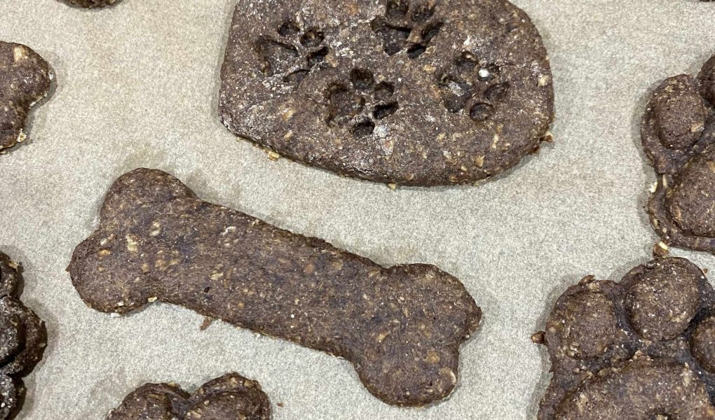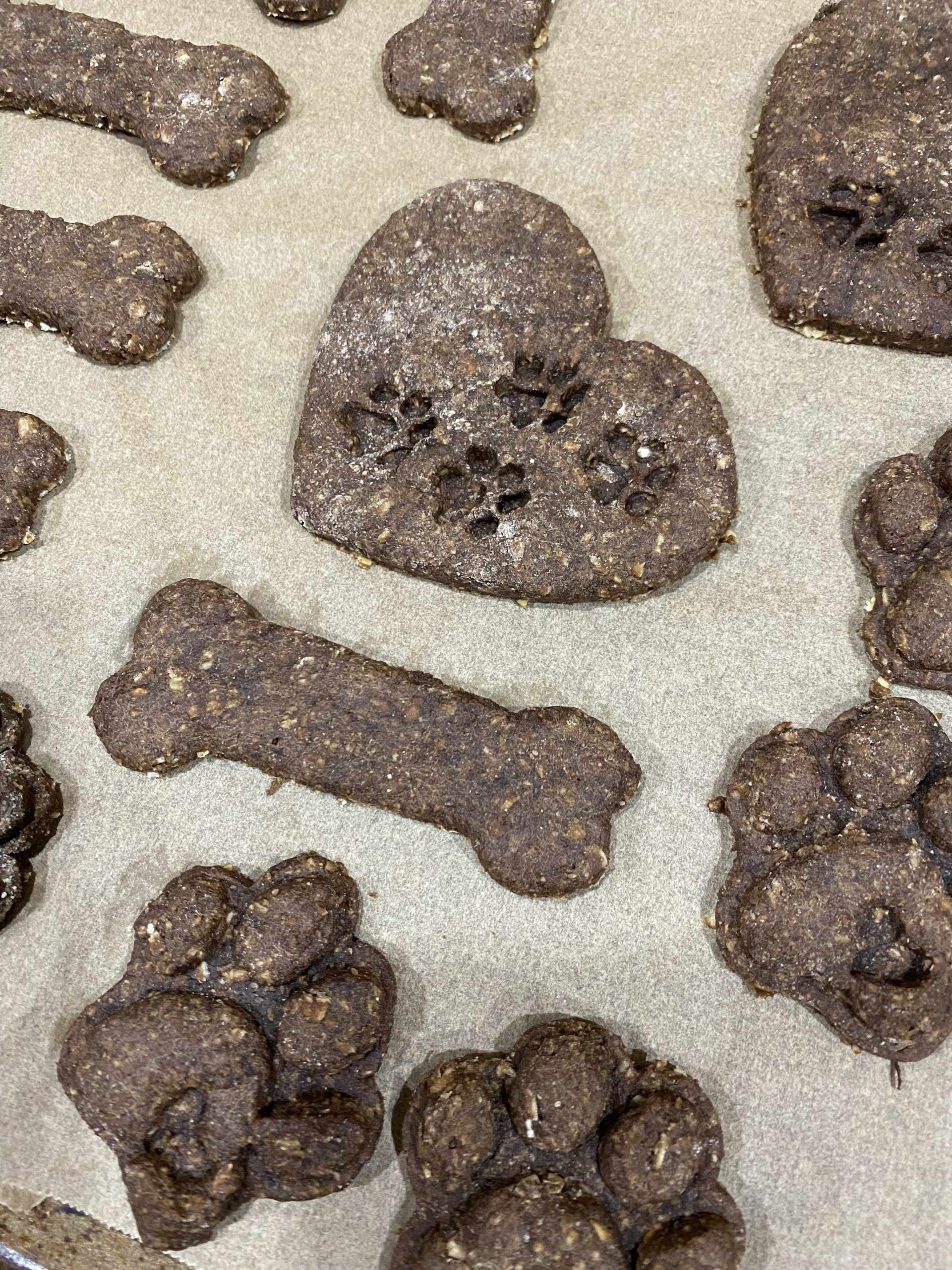 I have a few of my own recipes now! I have a carob cookie and a wheat free treat for the pups. Before I can offer these for sale I have to have them tested which involves sending to a lab which tests for the amount of protein, fiber, moisture, fat and calories. They then provide me with that information which then goes on the labels. So a little more than just coming up with a recipe. They look a little ‘oaty’ in this picture but since this picture was taken I have perfected making my own oat flour. If you are concerned about Carob, check out this article which has some great info on carob and dogs.